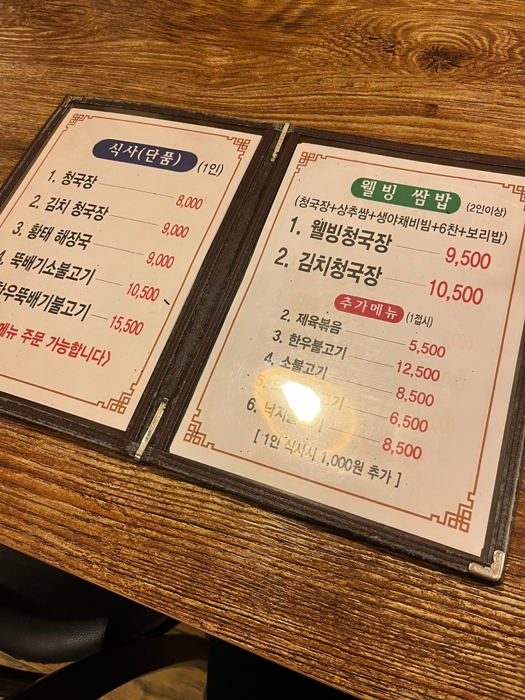 목재의 따뜻한 분위기에 메뉴도 다양하고 가격도 좋습니다. 저희는 웰빙청국장에 제육볶음을 추가해서 먹었는데 좋은 선택이었습니다. 웰빙청국장과 그냥 청국장의 차이는 쌈채소와 반찬과 보리밥에 차이가 있습니다. 가격차이가 크지는 않았서 웰빙쌈밥을 먹는 것을 추천합니다.