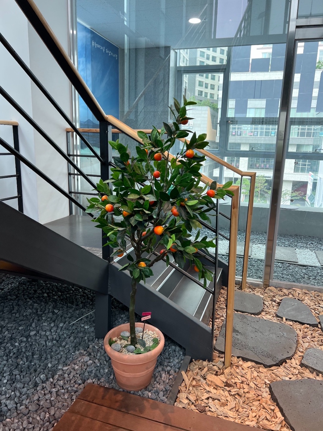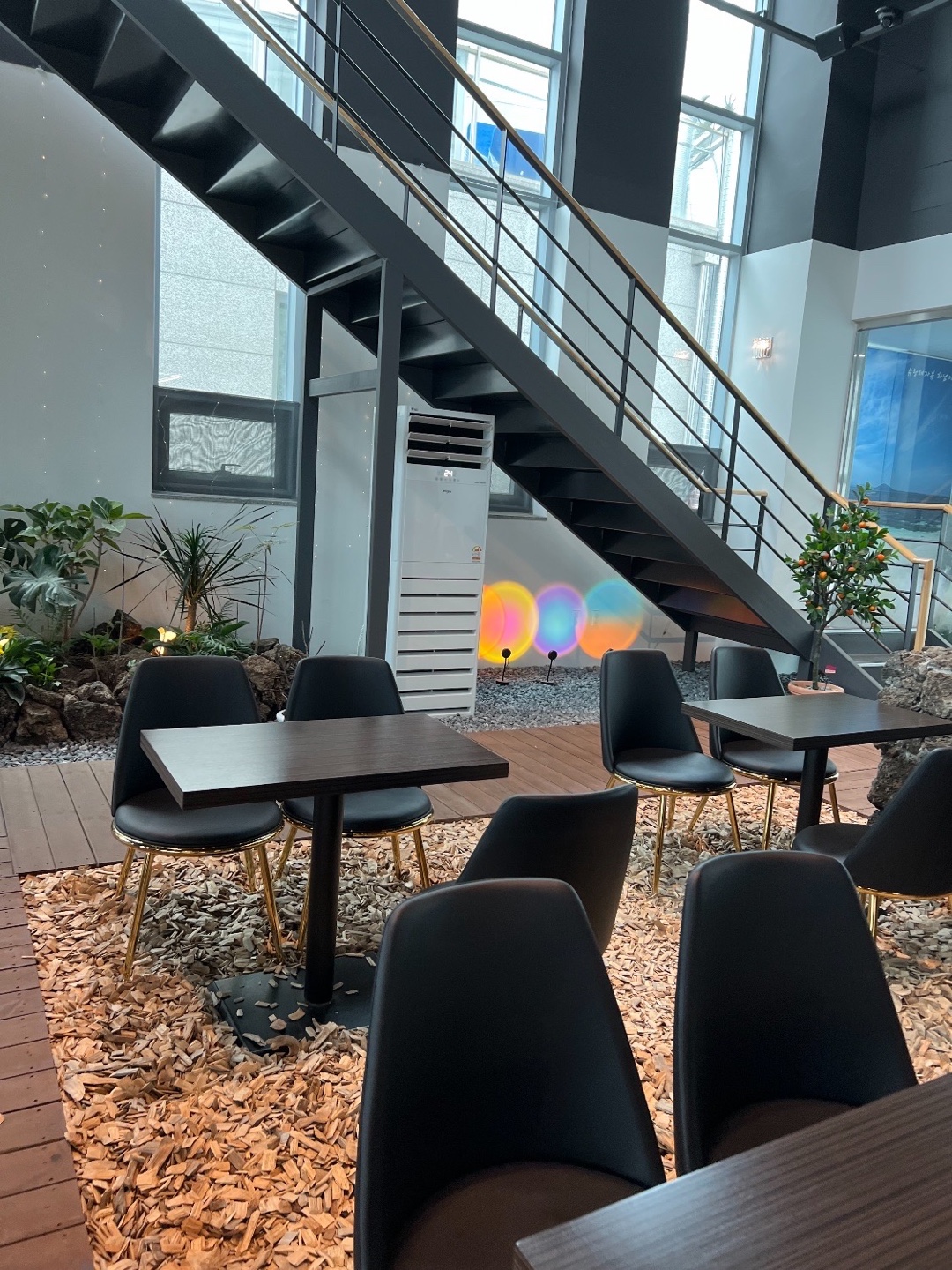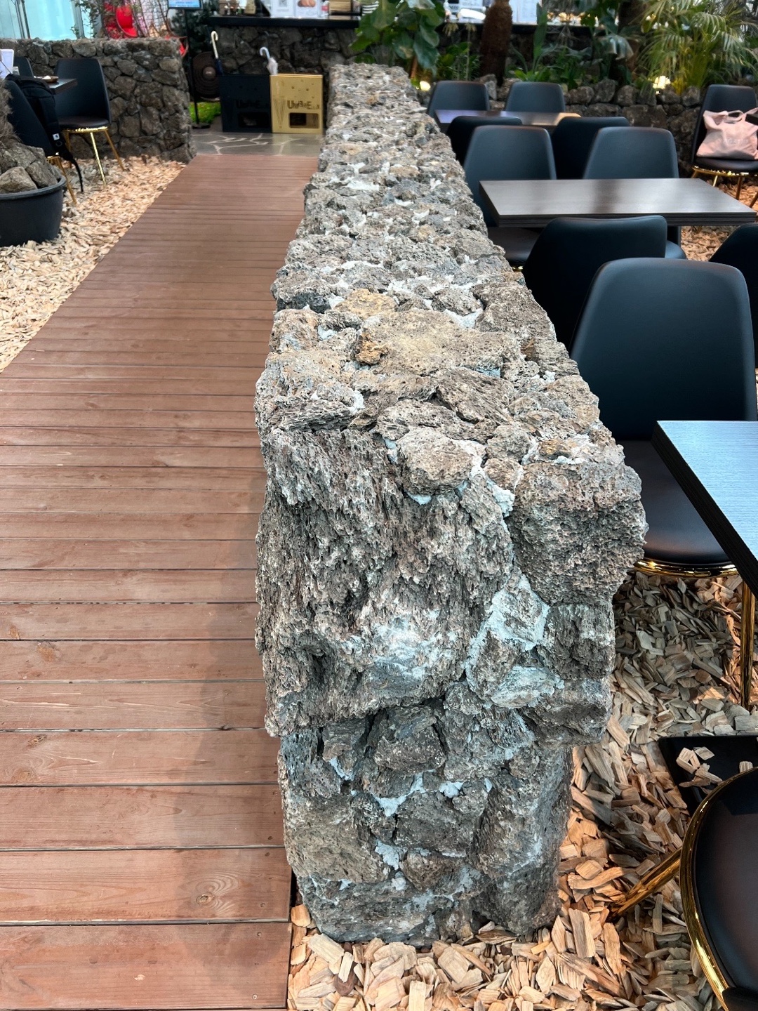 카페 내부의 인테리어를 보면 제주의 돌담들도 있고 감귤나무모형도 있고 발 밑에는 톱밥들이 있습니다.