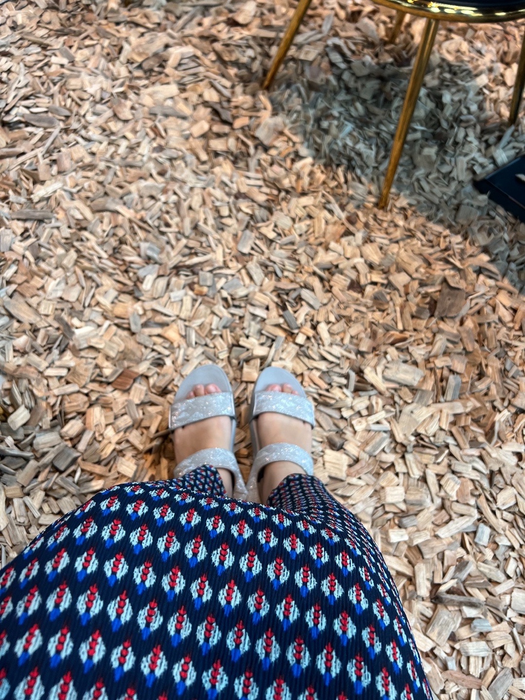 여름 샌들과 원피스를 입고 톱밥 위에서 괜히 사진을 찍어보았습니다.