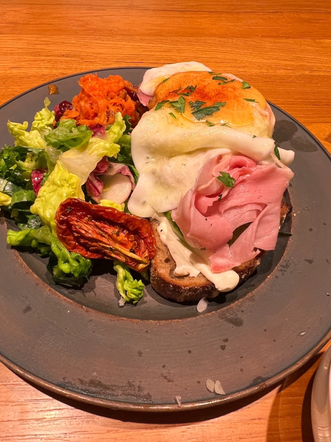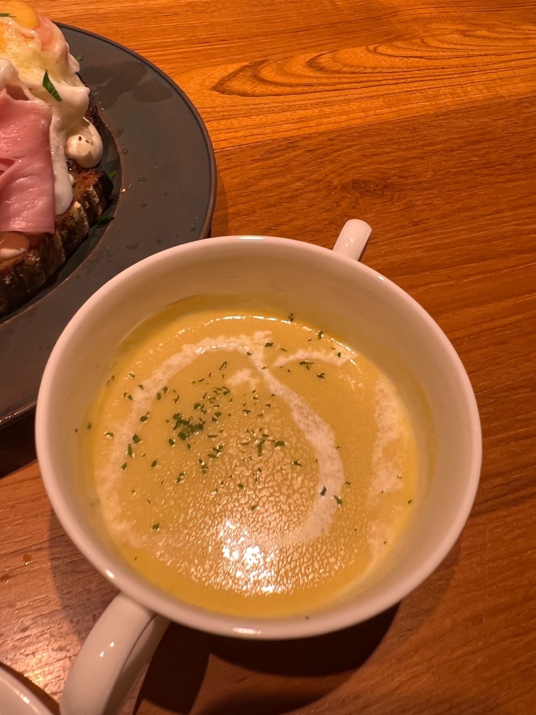 블루스퀘어의 공연을 보러 가는 날이면 매일 찾아오게 되는 곳입니다. 자리가 1층 지하 1층 넓게 있어서 붐비지 않고 기다리지 않고 바로 앉아서 식사를 할 수 있는 한남동에 몇 없는 식당입니다. 저와 오빠는 에그 베네딕트를 주문했습니다. 그러자 무슨 옥수수맛이 나는 수프가 나왔는데 되게 맛있었습니다.
