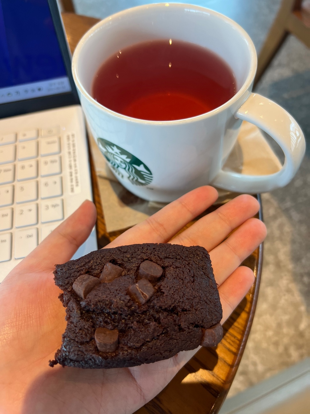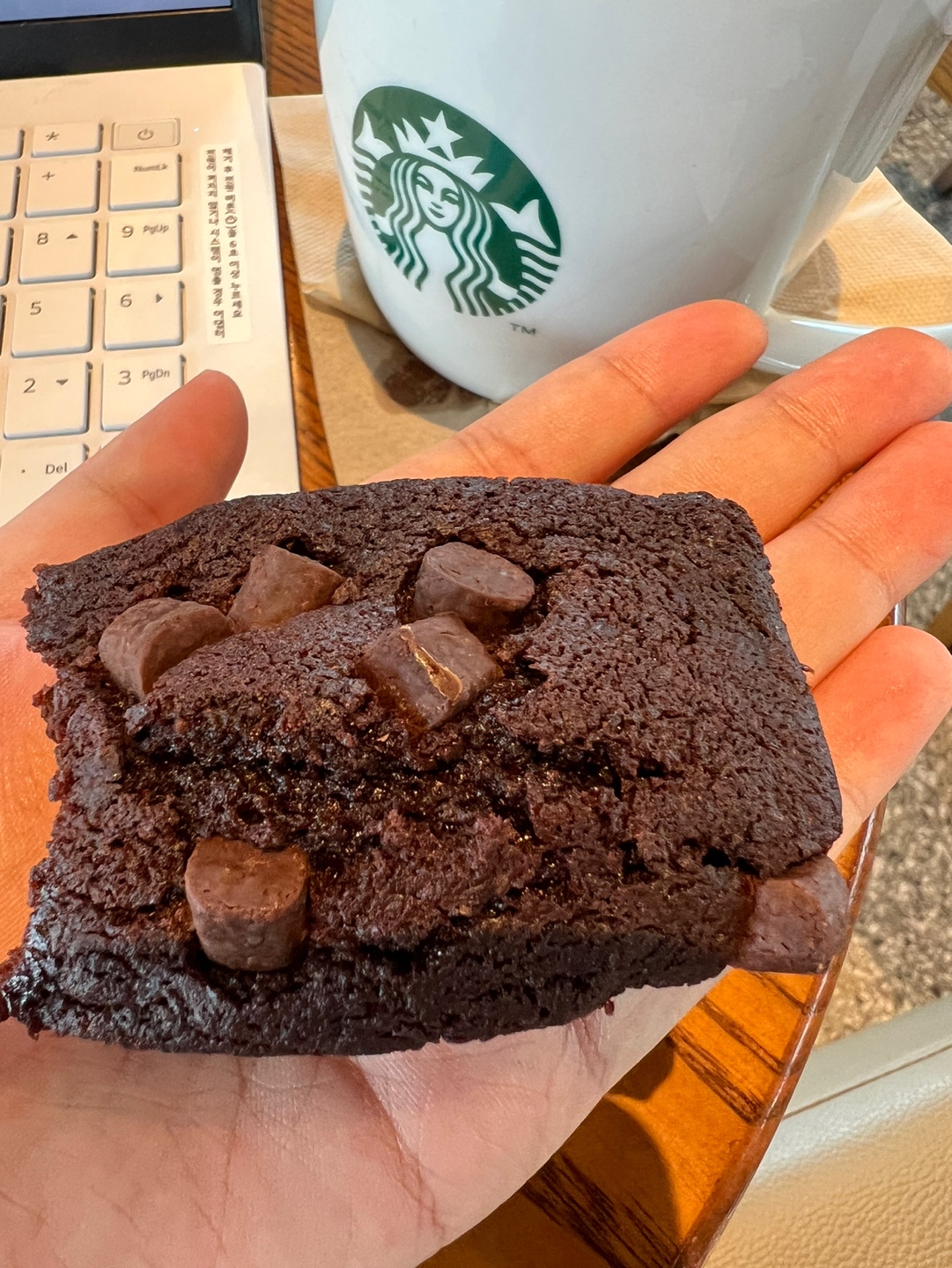 이건 스타벅스의 초코휘낭시에 입니다. 먹다가 급하게 찍었습니다. 이 휘낭시에는 단단하기보다는 부드러운 휘낭시에입니다. 차갑게 약간 얼려서 먹으면 더 맛이 있을 거 같습니다.