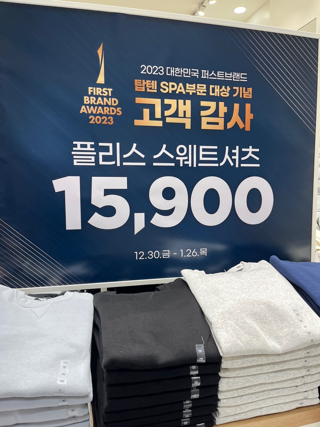 하남스타필드의 톱텐을 방문하였습니다. 지금 연말이라고 감사제 세일을 하고 있었습니다. 오랜만에 가본 톱텐이었는데 옷의 종류와 질이 상당히 좋아서 놀랐습니다. 재질도 부들부들 좋고 디자인적으로도 다양하고 좋았습니다.