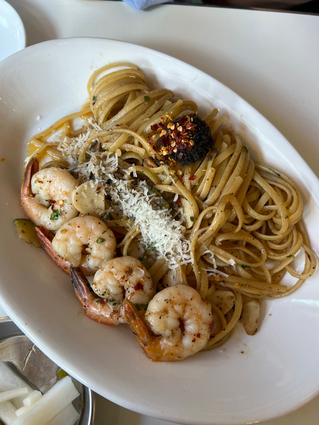 알리오 올리오입니다. 새우가 싱싱하고 기름이 고소하고 맛이 있었습니다.