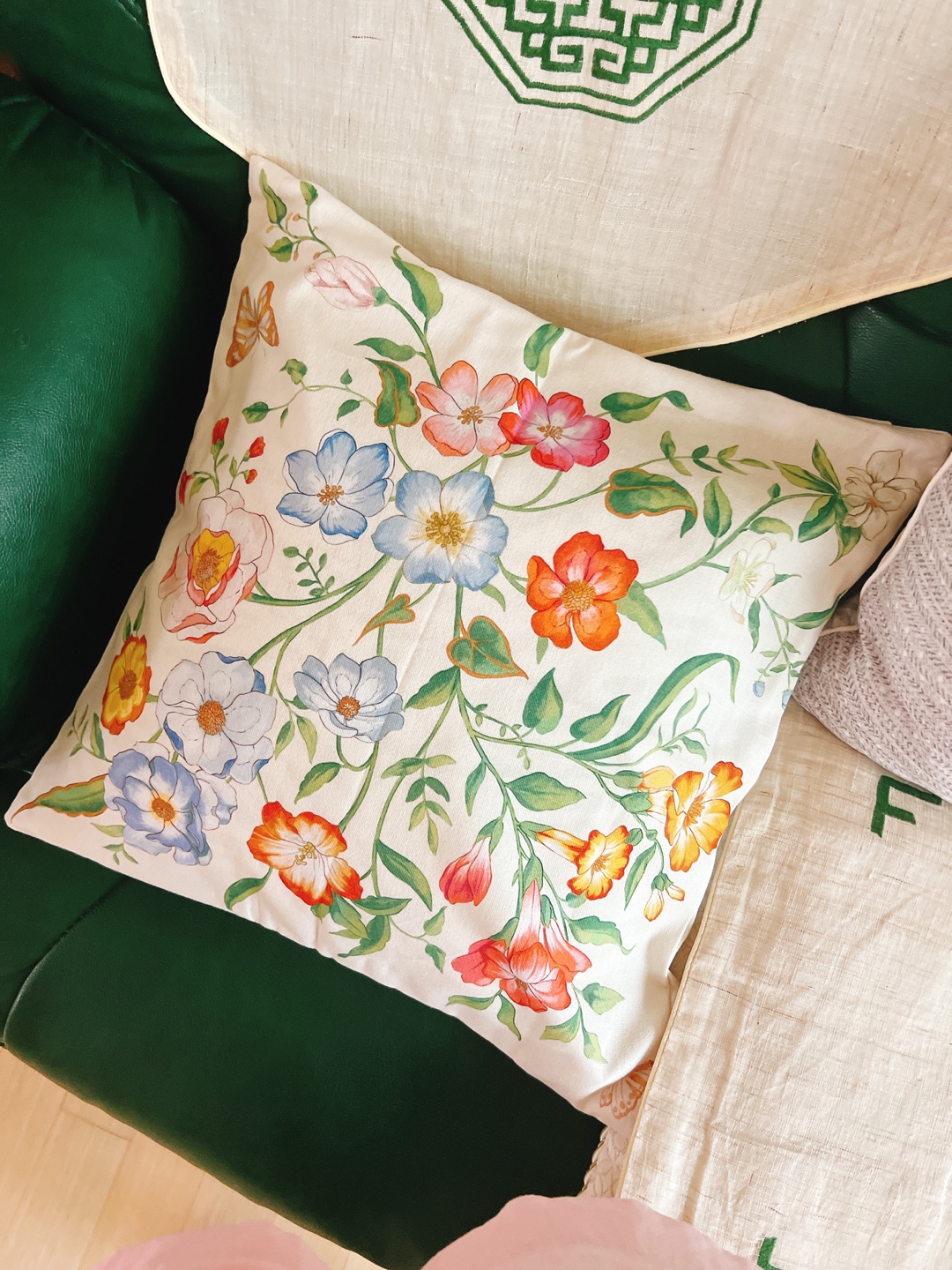 저기 보이는 꽃쿠션이 자라홈에서 구입한 쿠션입니다. 다양한 꽃들이 그려져 있어서 싱그러운 기분을 느끼게 합니다.