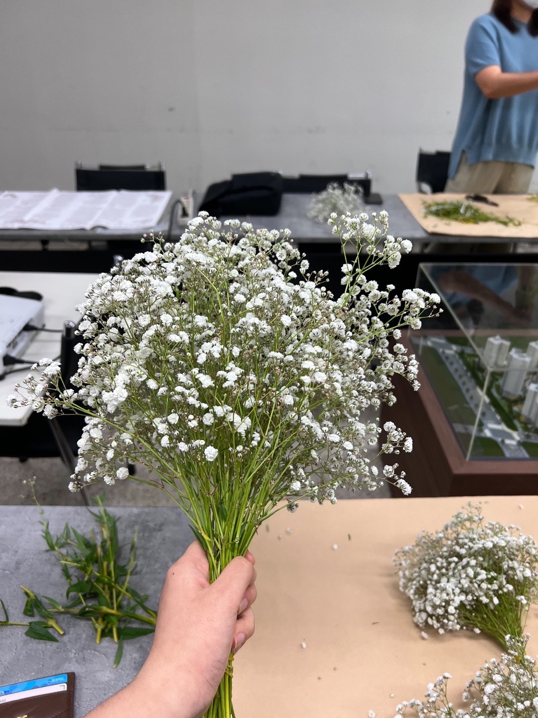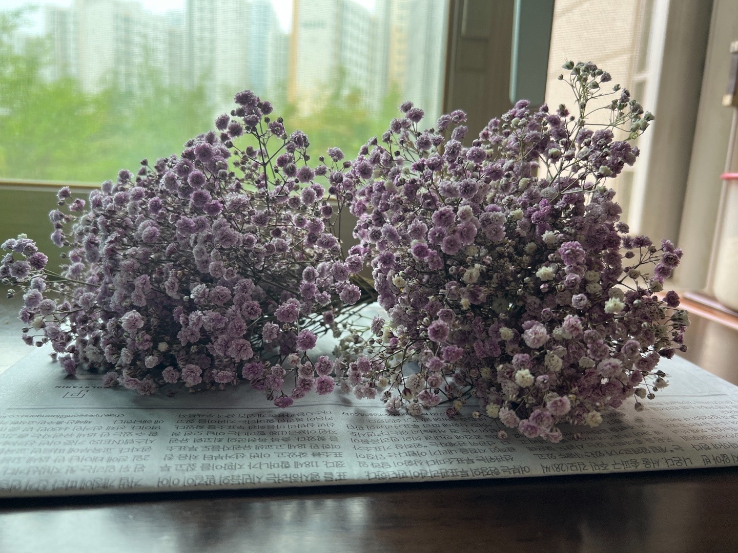 오늘은 안개꽃으로 수업받았습니다. 안개꽃은 몽우리가 작아 괜히 정감이 가는 꽃입니다. 그리고 오늘은 특별하게 안개꽃을 염색해서 배운다고 하여 신기했습니다. 염색은 정확히 이야기하면 보라색 물을 빨아들여 물들어버리는 것이었습니다.