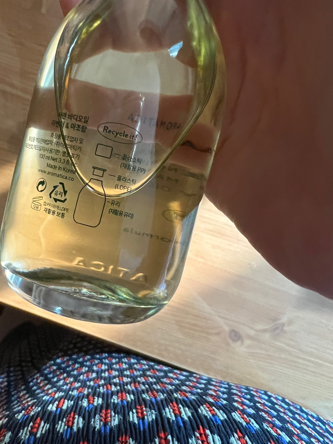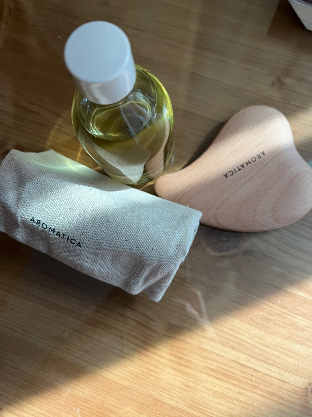 보디 오일과 우드 괄사의 모습입니다. 우드 괄사가 생각보다 큰데 얼굴, 발 종아리 등 방향에 따라서 쓰임새가 있다고 합니다.
