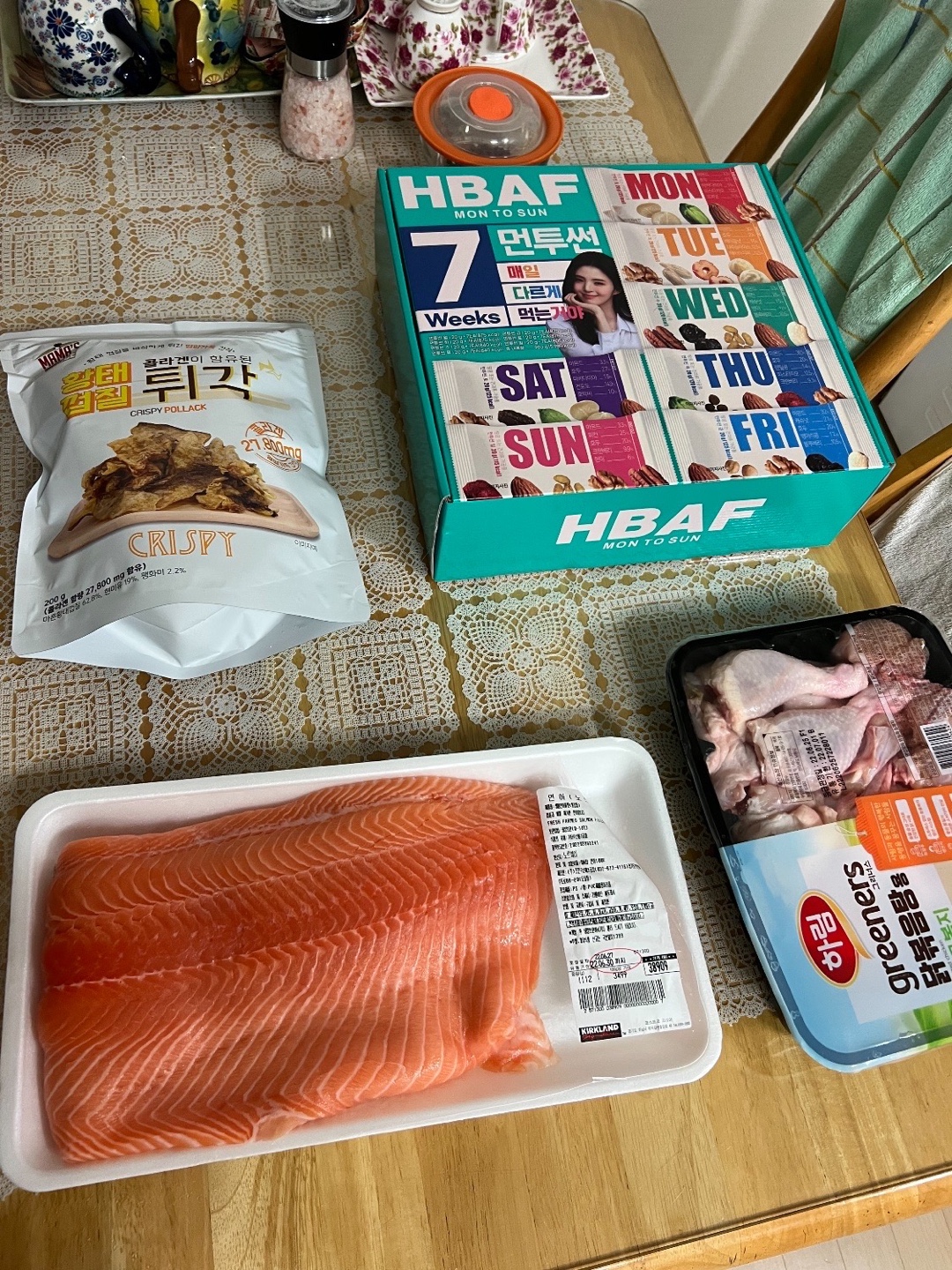 이렇게 총 4 가지 식품을 코스트코에서 구입해왔습니다. 요일별로 먹는 견과류, 연어, 손질이 된 닭, 튀각을 샀습니다.