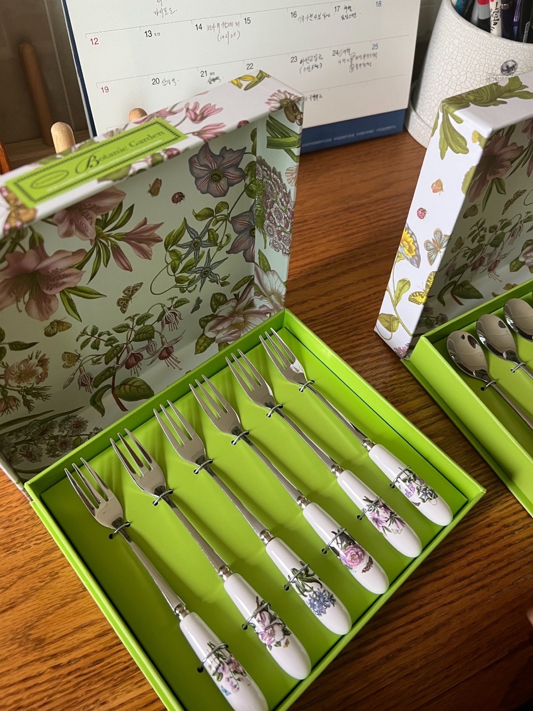 포트메리온 그릇은 많이 사용해보았는데 포크와 숟가락 세트가 있는지는 몰랐다. 좋은 기회로 포트메리온 도구들을 구입하게 되었습니다. 좋았던 점은 포크 뒤에나 통통해서 잡는 느낌이 좋다는 사실입니다. 그래서 잘 미끄러지지도 않고 좋습니다. 작은 숟가락의 경우에도 동일했습니다. 뒤에가 통통했고 대부분 나오는 미니 숟가락들은 앞에 떠먹는 부분이 타원형이라 싫었는데 여기 숟가락은 동그래서 너무 귀여웠습니다.