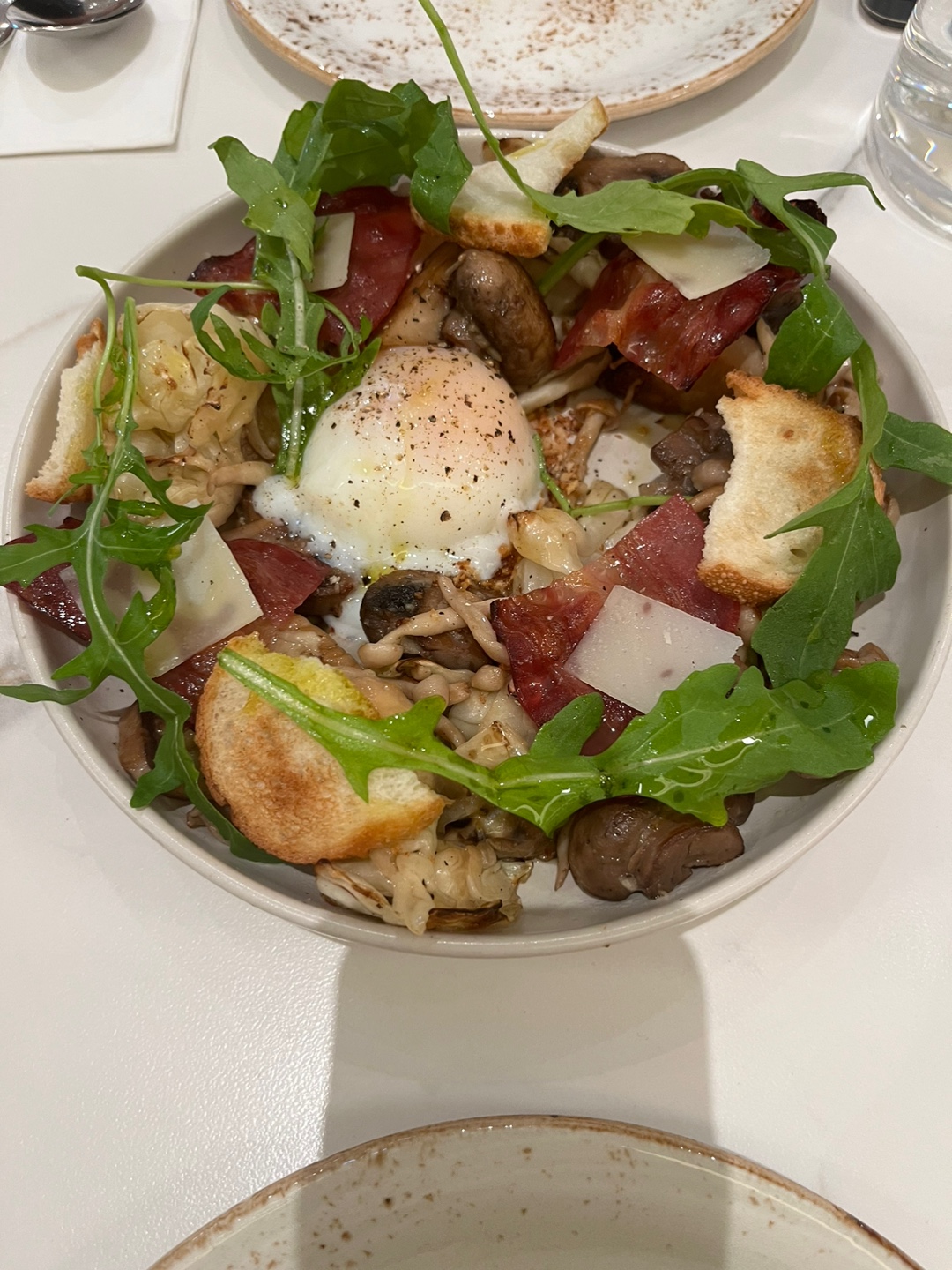 버섯으로 시작하는 파스타입니다. 여러 종류의 버섯이 들어가 있고 베이컨, 마늘, 수란까지 정말 맛이 있습니다.