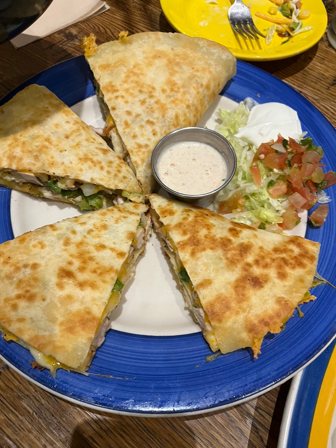 멕시코 음식들 중에서 타코 이후로 가장 유명한 퀘사디아입니다. 위의 하얀색 소스에 찍어먹으면 맛이 일품입니다.