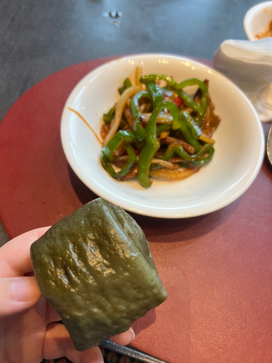 쑥이 들어간 꽃빵에 고추잡채랑 먹으니 너무 맛있었습니다.